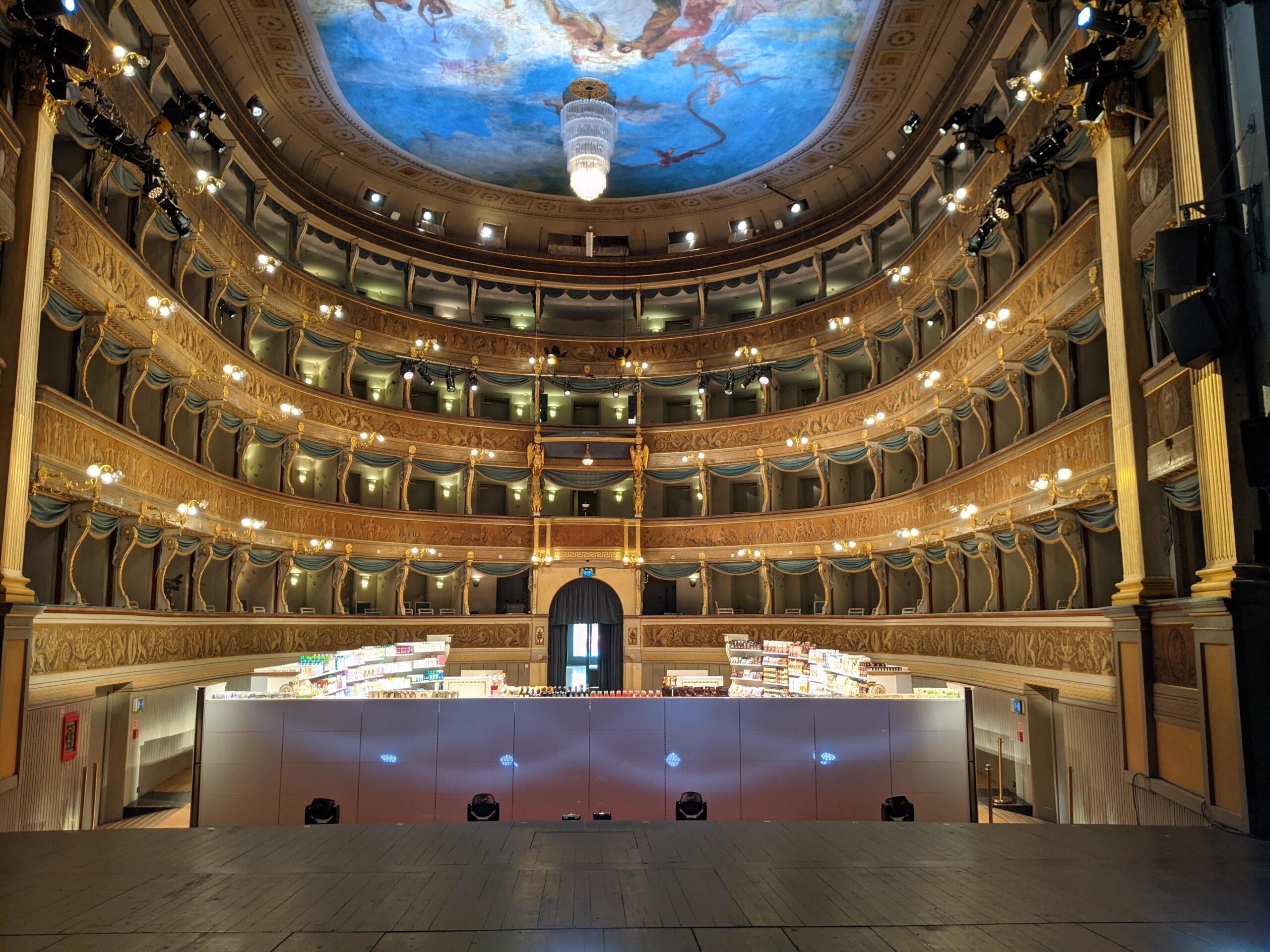 Interim Measure è un’opera che gioca con le regole del reale e le norme del quotidiano per spostare il modo in cui guardiamo ai luoghi della cultura. Anna Scalfi — conosciuta per una pratica artistica che fonde riflessione sociale e dispositivi concettuali — ha trasformato il Teatro Sociale di Trento in un ambiente sentimentale e normativo dove il teatro diventa supermercato.