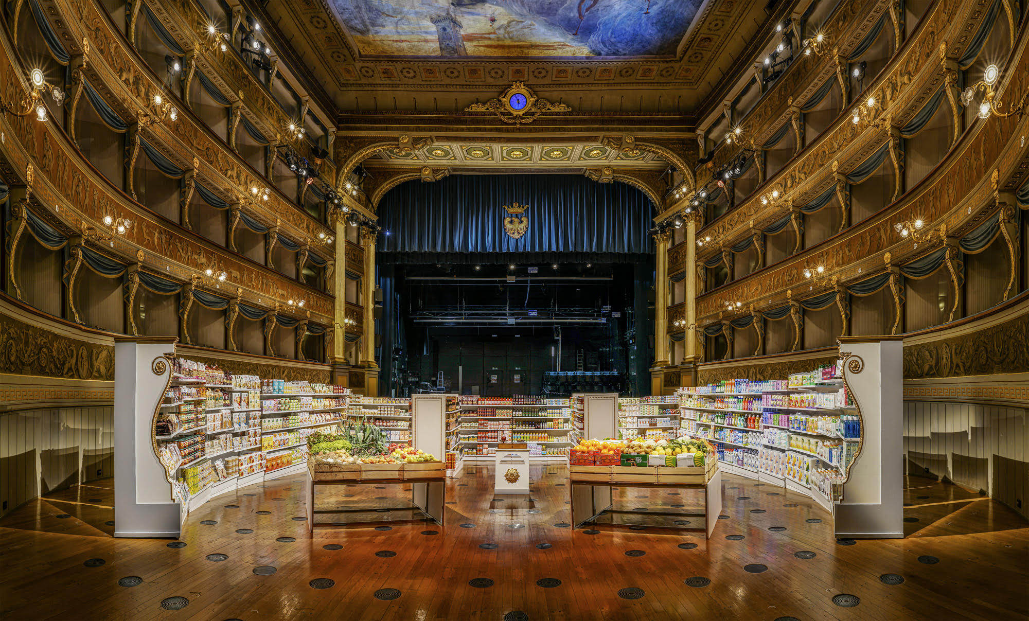 In Interim Measure (Misura Temporanea) l’artista ha composto una situazione paradossale e provocatoria: gli spettatori non entrano nel teatro come pubblico di uno spettacolo, bensì come clienti di un supermercato allestito nella platea. Gli scaffali con prodotti – reali e acquistabili – sono stati collocati al posto delle poltrone, e l’intera installazione è stata concepita per aderire alle norme di sicurezza vigenti durante le chiusure da emergenza sanitaria. L’opera richiama così l’attenzione sul diverso trattamento riservato ai luoghi culturali e ai servizi considerati “essenziali” come i supermercati.